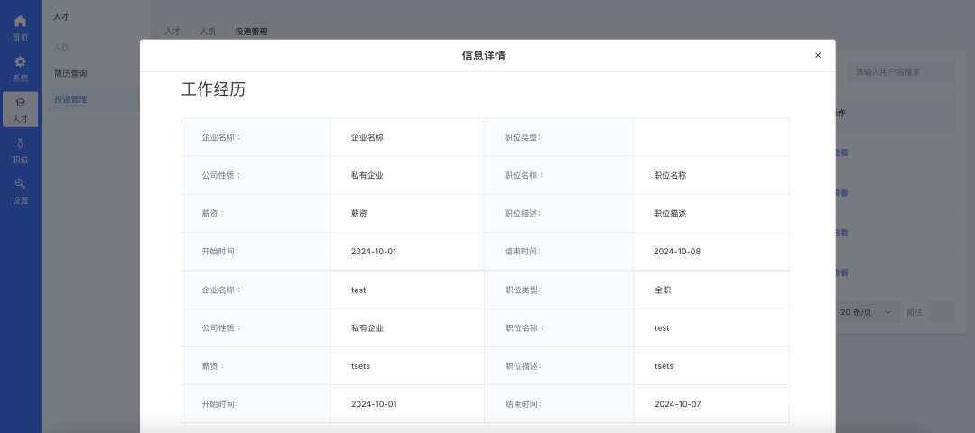 图示:招聘管理后台,单个简历的详情页面,清晰展示候选人的多段“工作经历”列表。