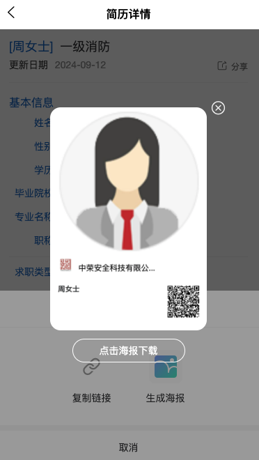 为微信小程序端的简历功能增加海报生成与分享能力。当求职者提交简历并上传个人头像后,即可一键生成包含个人头像、关键信息与专属二维码的个性化海报,便于社交分享传播。