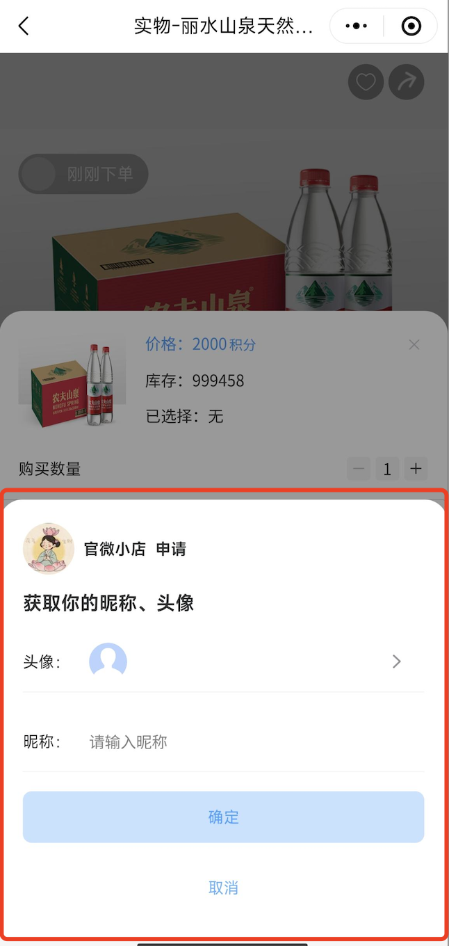 如商家开启了头像昵称提示且该用户未设置,则在提交订单前弹出授权窗口,用户必须设置头像和昵称后方可继续下单。