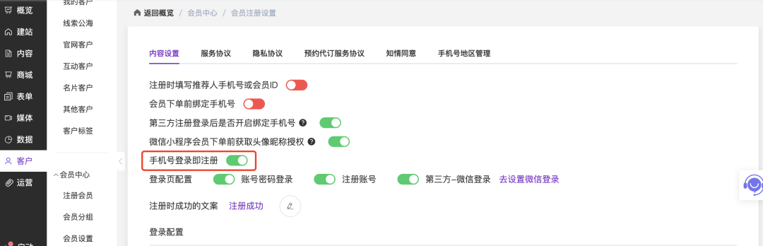 图示:官微中心后台,「会员中心-注册设置」中,“支持手机号登录即注册”功能的开关位置。