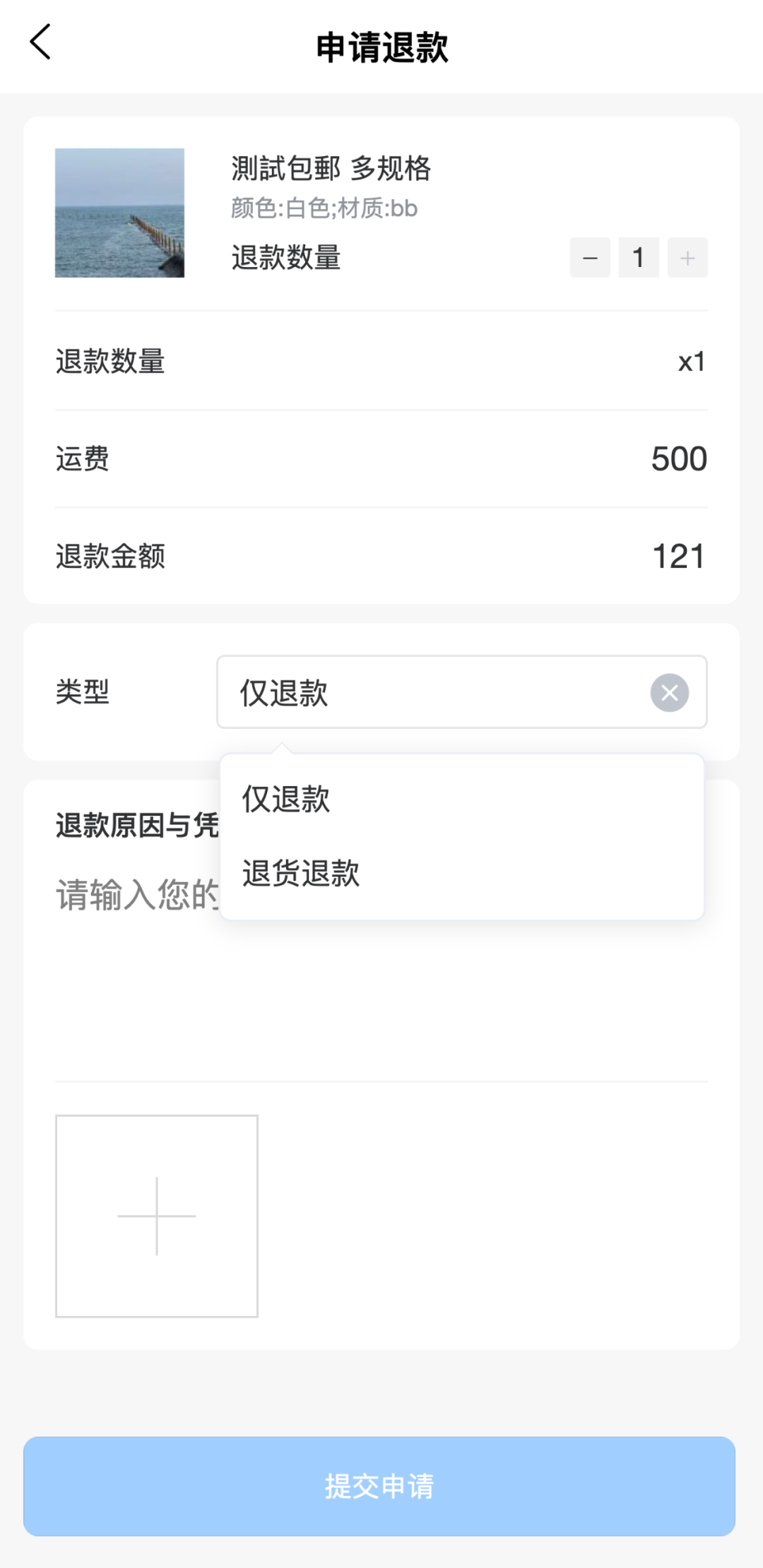 图示:买家在订单详情页,选择“退货退款”类型并填写申请信息的界面。