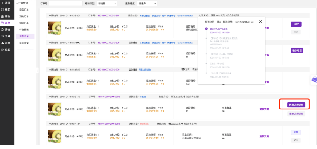 图示:商家后台的退款申请管理列表,可点击“同意退货退款”等按钮进行操作。