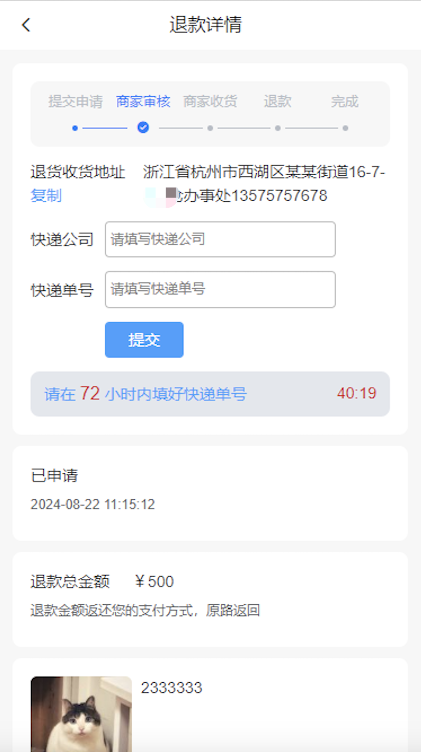 图示:商家审核通过后,买家在退款详情页填写寄回快递公司与单号的界面。
