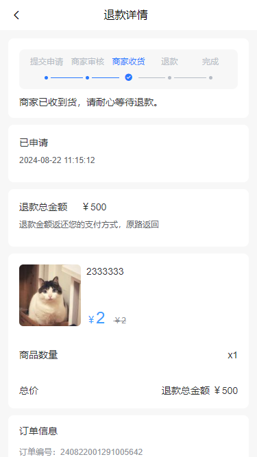 商家收到退货后,在后台该订单的退款详情中,操作“确认收货”,状态更新。