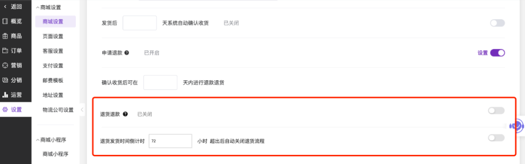 商家登录后台,进入「商城-设置-退货退款」,开启功能总开关,并根据需要设置退货有效时限(如72小时)。
