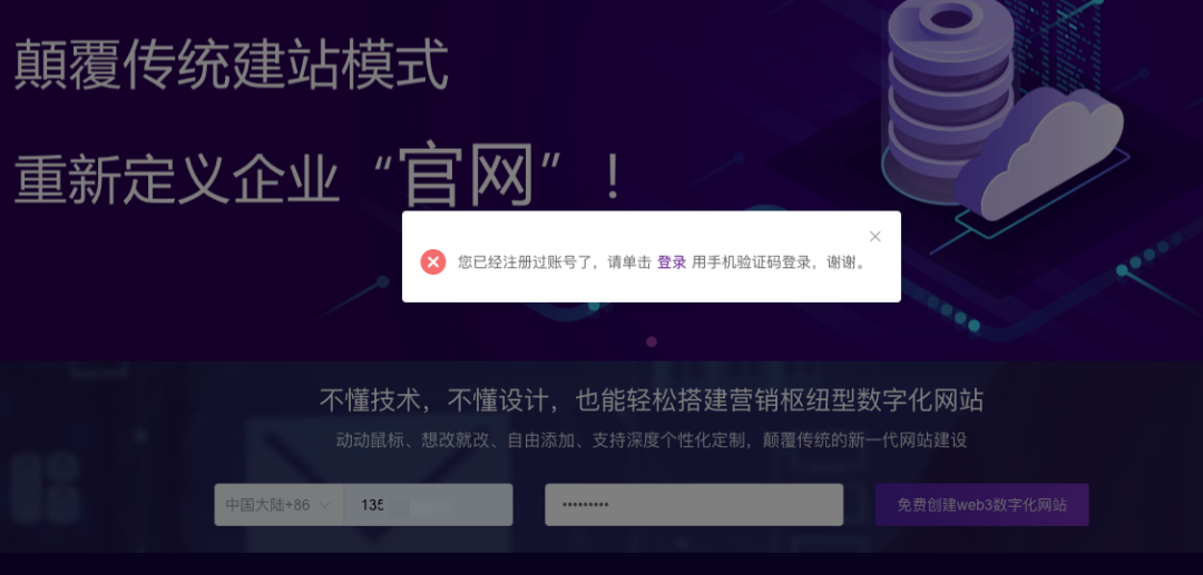 图示:在官网建站入口,输入已注册手机号后,系统弹出的友好提示框,内容为“该手机号已注册,请前往官微中心登录”。