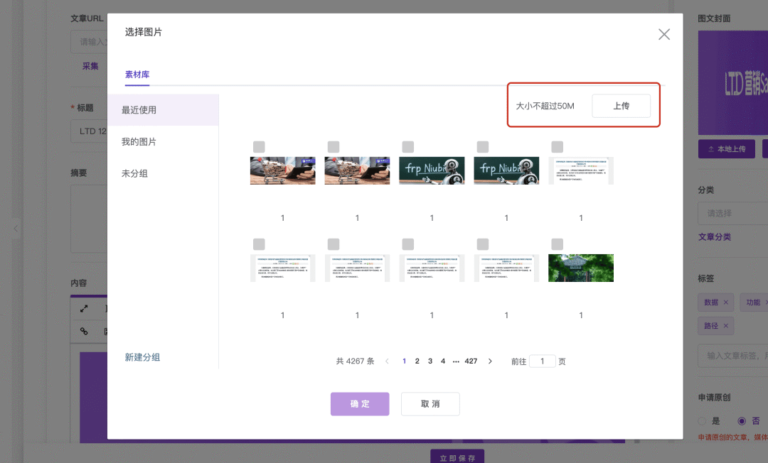 图示:素材库的上传区域,提示信息已更新为支持最大50MB的图片文件。