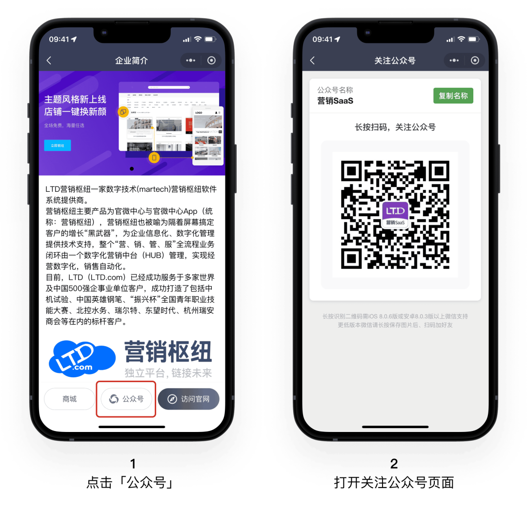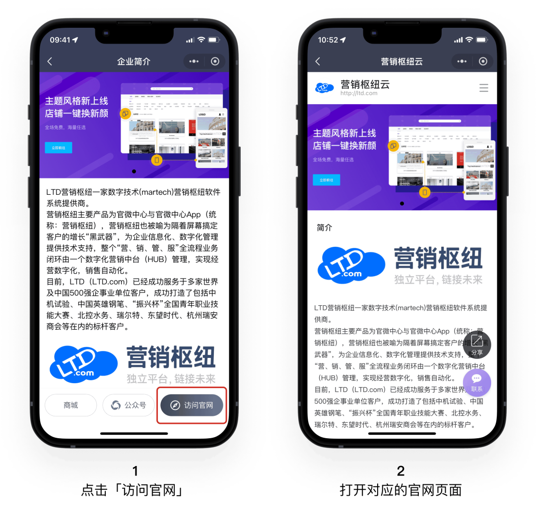 用户浏览顶部Banner,在页面底部根据企业配置,可看到并点击“访问官网”、“进入商城”、“关注公众号”等按钮,分别跳转至对应的小程序或页面。