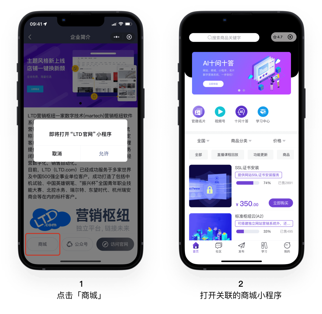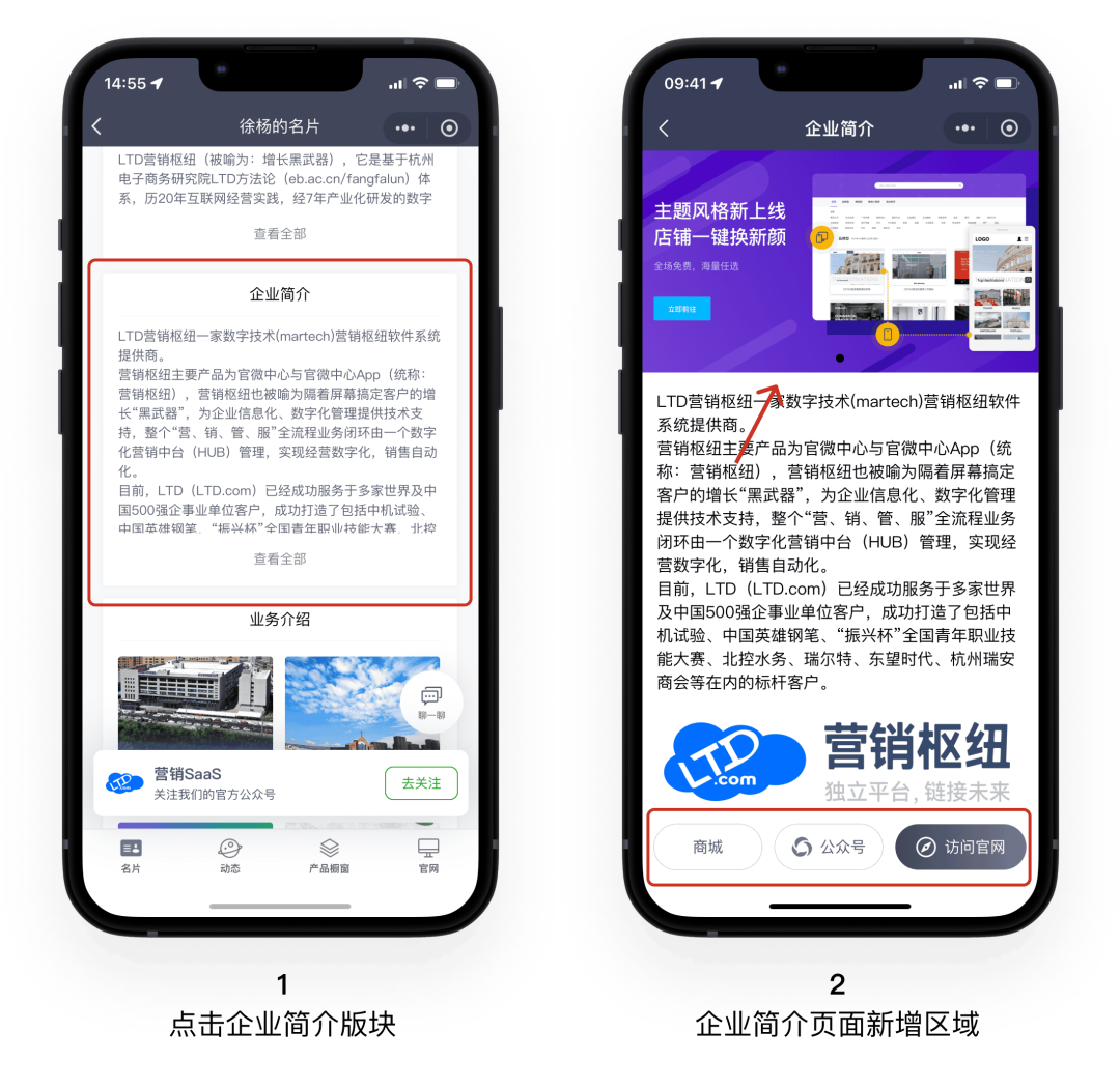 在企业简介页面底部,智能集成并展示“官网小程序”、“商城小程序”、“官方公众号”等多个核心业务入口。用户可根据企业配置,一键跳转,实现从名片到业务的无缝导流。
