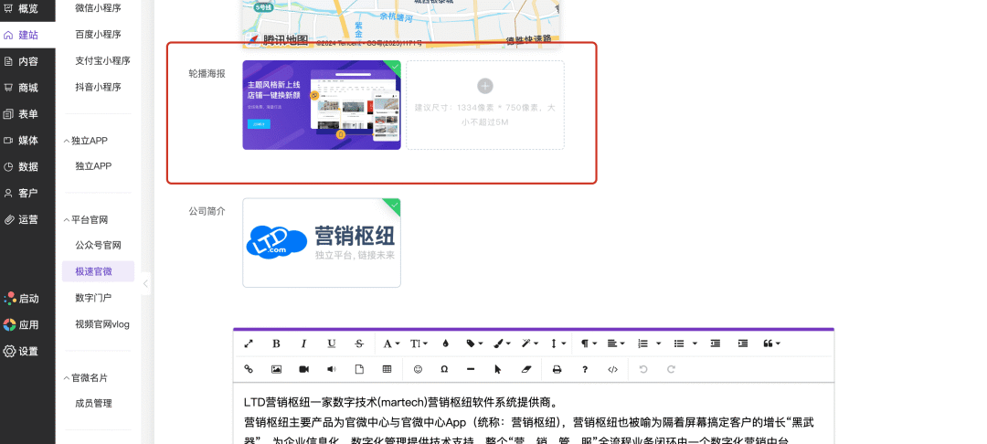 进入「建站 - 极速官微」模块,在“轮播海报”区域,上传用于企业简介页顶部展示的图片(建议16:9比例)。