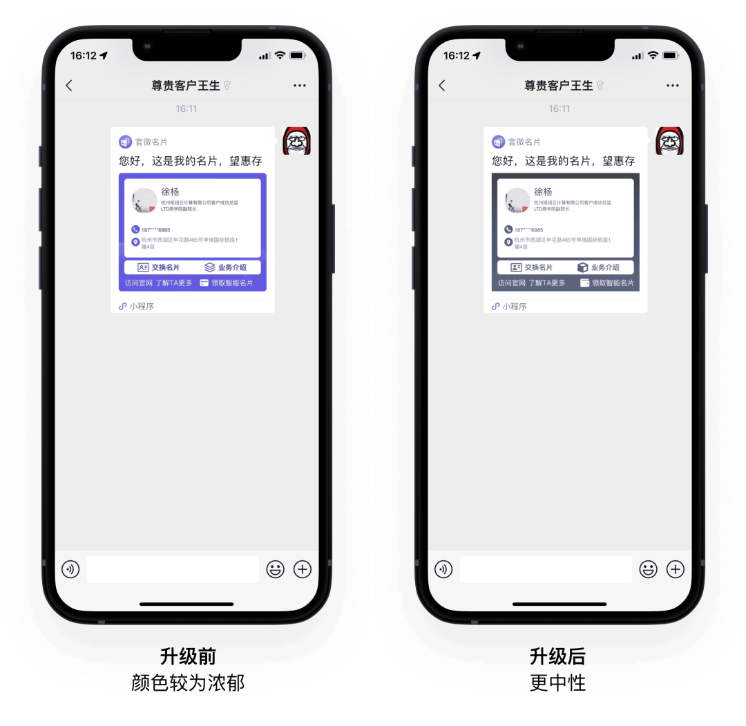 用户在微信中分享该名片时,生成的分享卡片将自动采用新的、更具质感的深色背景样式。