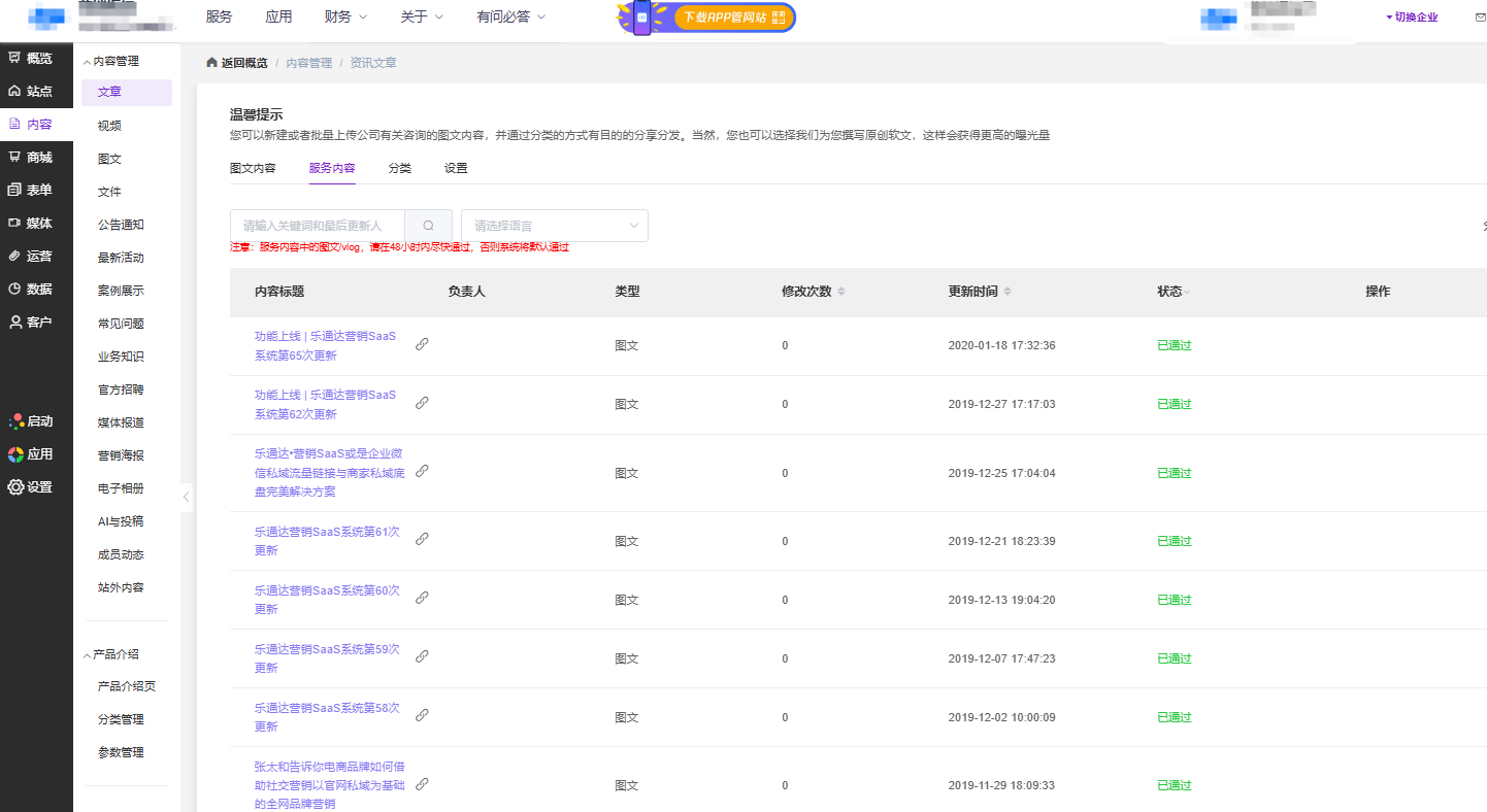 审核人员在列表页处理待审内容,通过后状态变更为“已通过”,内容自动发布到关联的站点或应用。