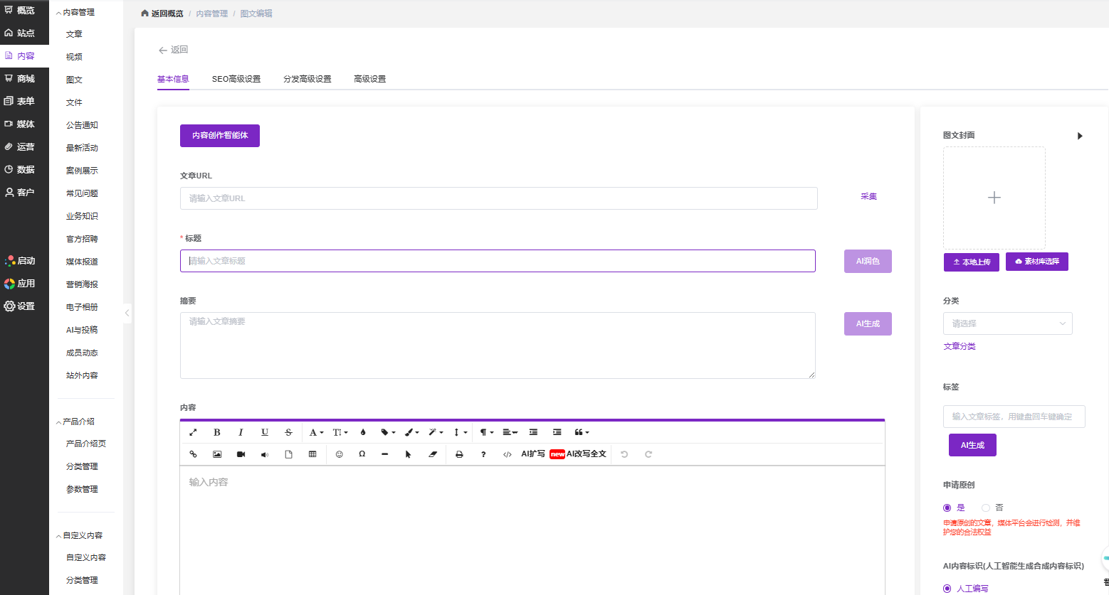 图示:集AI智能创作、富文本编辑、属性设置(封面/分类/标签)、SEO与原创保护于一体的高效内容生产车间。