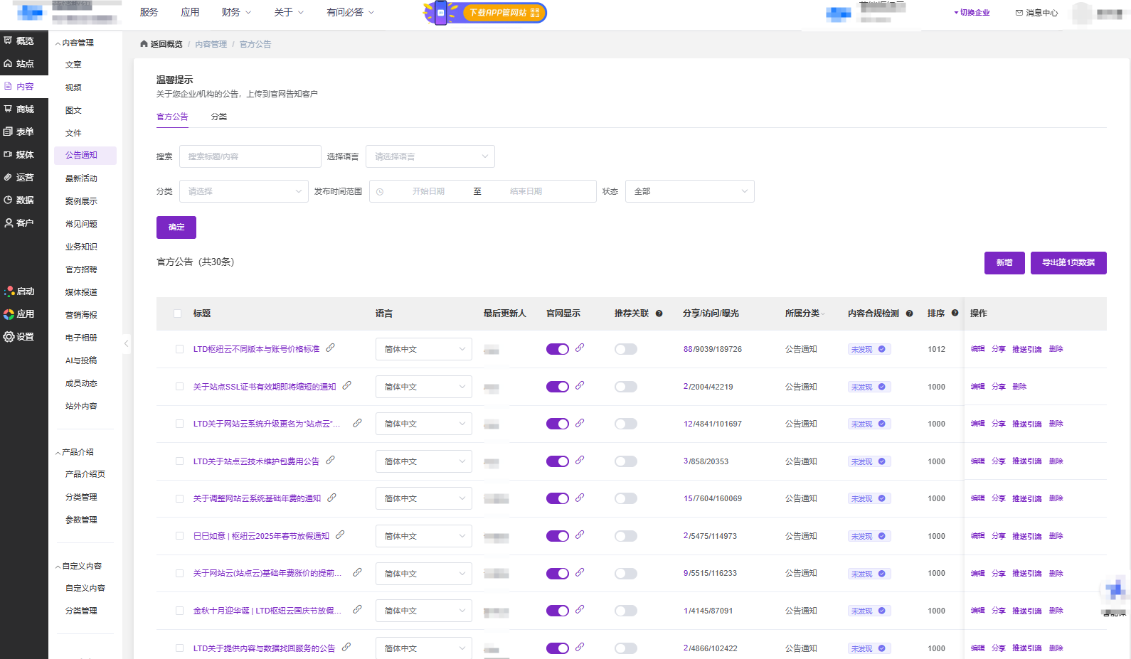 保存后返回列表页,打开“官网显示”开关使公告对外公开。利用“分享”按钮进行社交传播,或通过“推送引擎”进行精准推送。