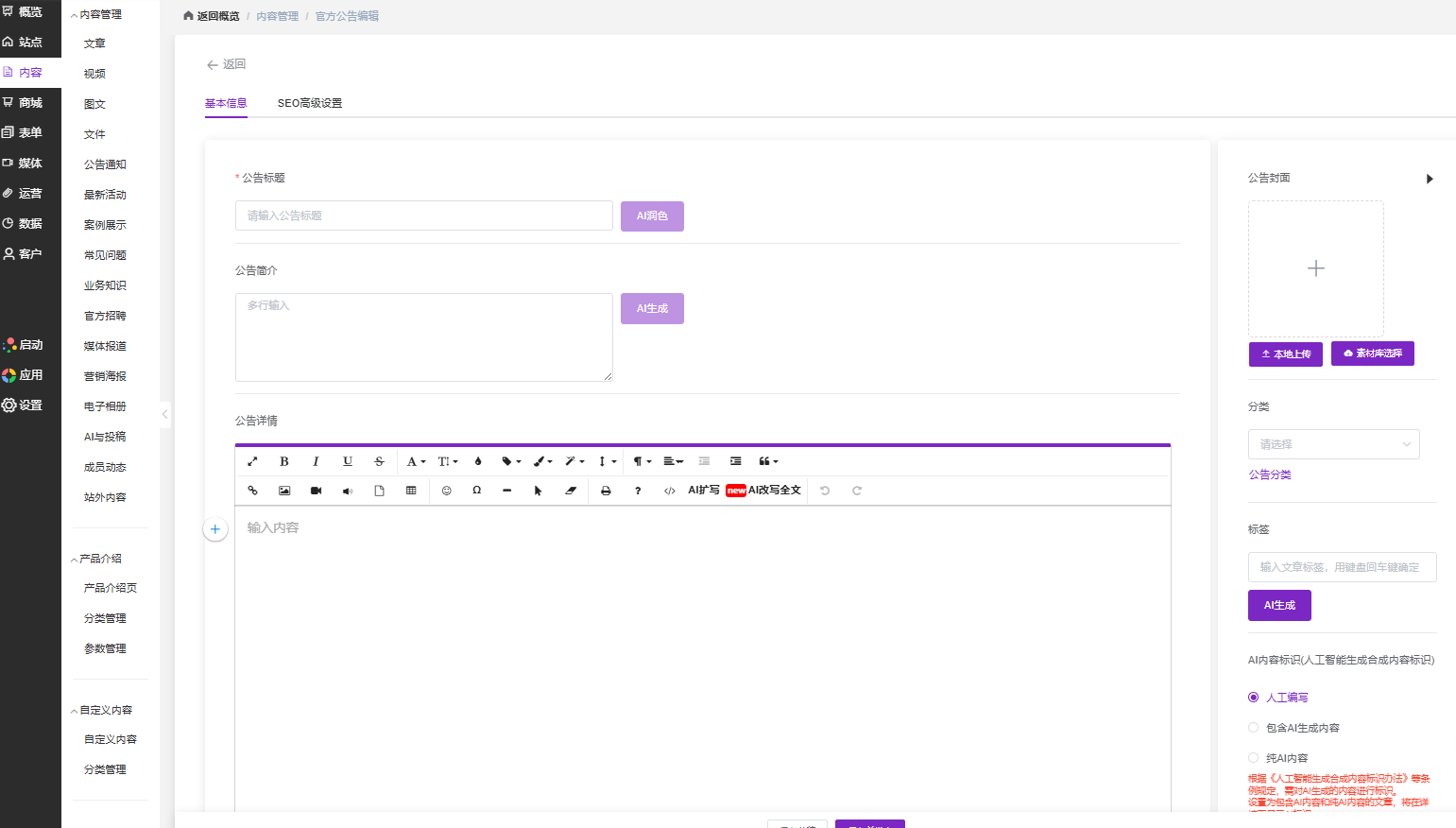 图示:一体化公告生产车间,集成了AI辅助创作、富文本编辑、封面设置、分类标签管理、合规标识、SEO优化等全流程功能,是高质量公告从0到1的生产平台。