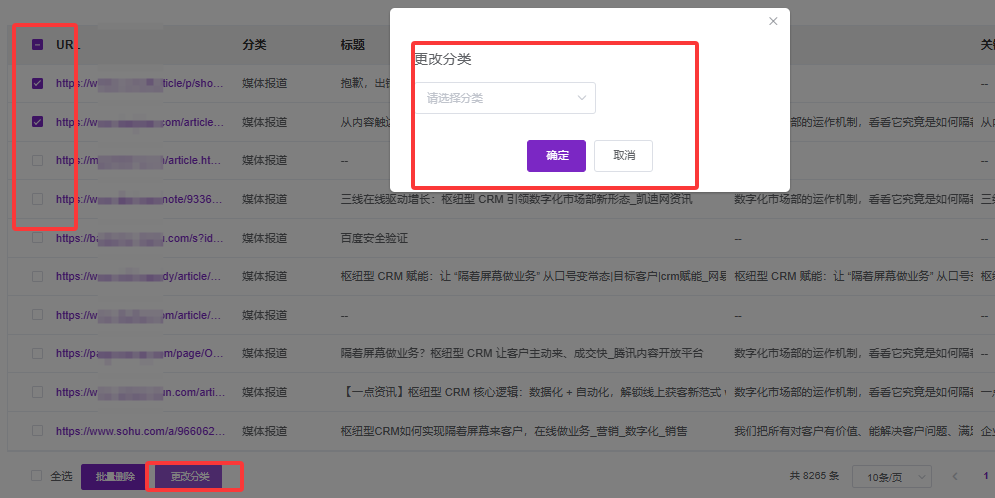 图示:海量内容属性批量调整工具,通过简单的下拉选择,即可对已勾选的大量页面进行统一的重新归类,体现了系统强大的批量处理能力。