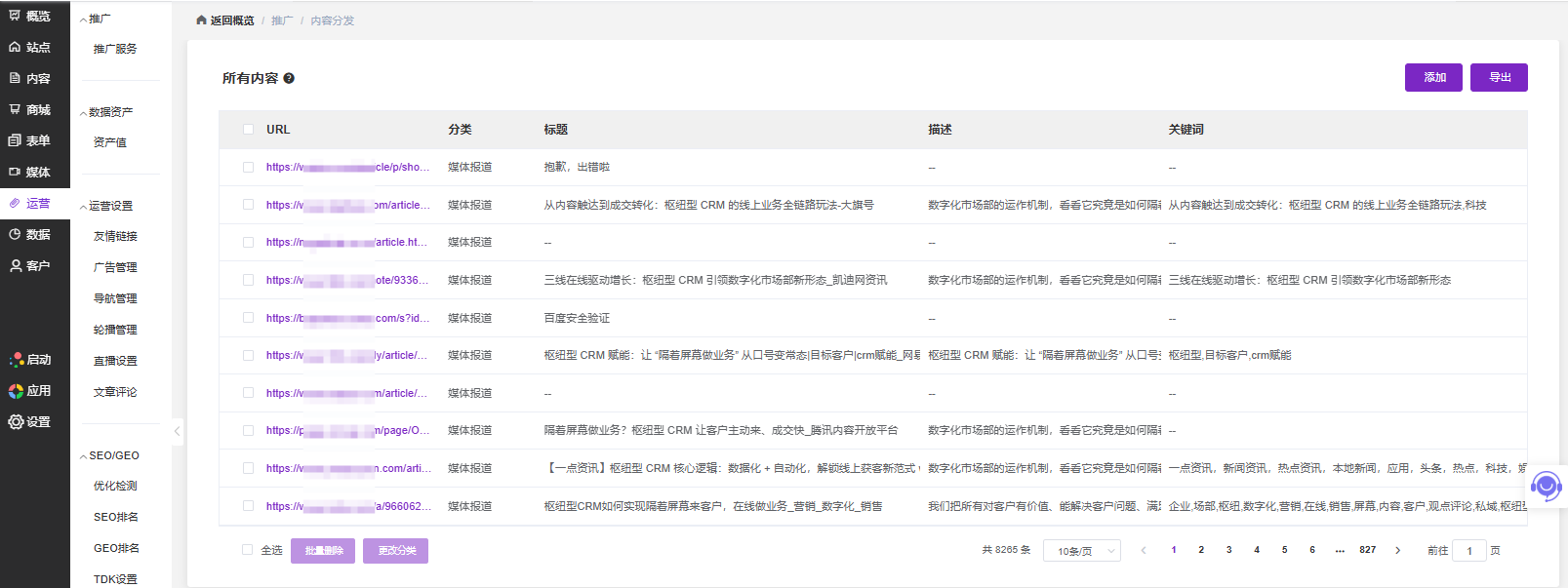 图示:网站SEO资产总览与操作中心,以表格形式集中展示全站所有页面(如8265个)的URL、标题、描述、关键词及分类,是执行全局审计、批量操作的核心“作战室”。