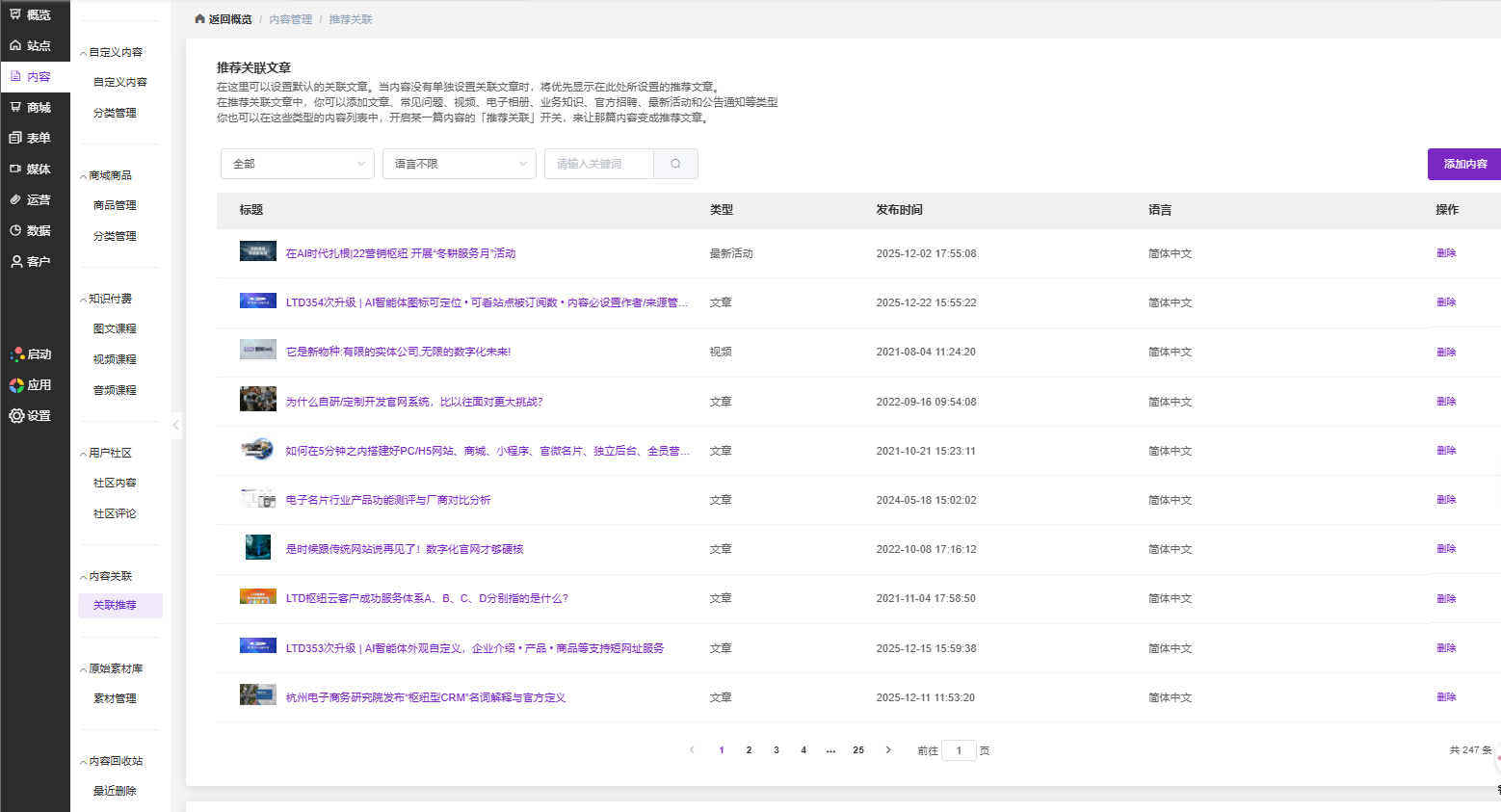 提供全局智能推荐、跨类型内容混合筛选及双轨关联管理,支持11万+内容精准匹配与批量操作,提升全站关联覆盖率与运营效率。