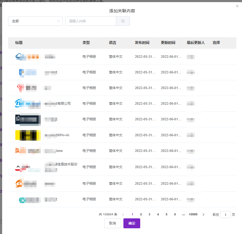 图示:全站内容智能筛选与选取器,可从海量内容库(如109,884条)中,通过筛选类型、搜索关键词,精准勾选目标内容,批量添加至全局推荐池。
