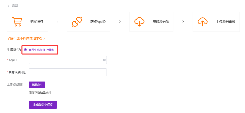 图示:一站式生成工作台,集成了服务购买、源码下载、审核上传等入口,并通过表单引导用户完成AppID绑定、官网校验、信息配置等关键步骤。