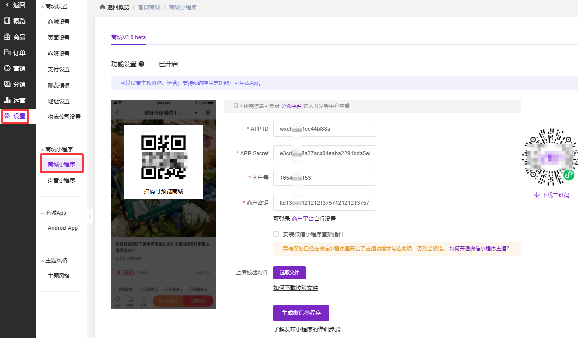 图示:商城型小程序深度管理后台,展示生成后对小程序主题、支付、物流、分销等电商功能的配置能力,并可预览与发布小程序。