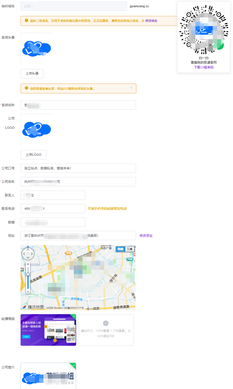 进入企业信息配置,完整填写公司名称、LOGO、口号、联系方式和地址。上传官微头像,此信息将作为所有小程序的数据源。