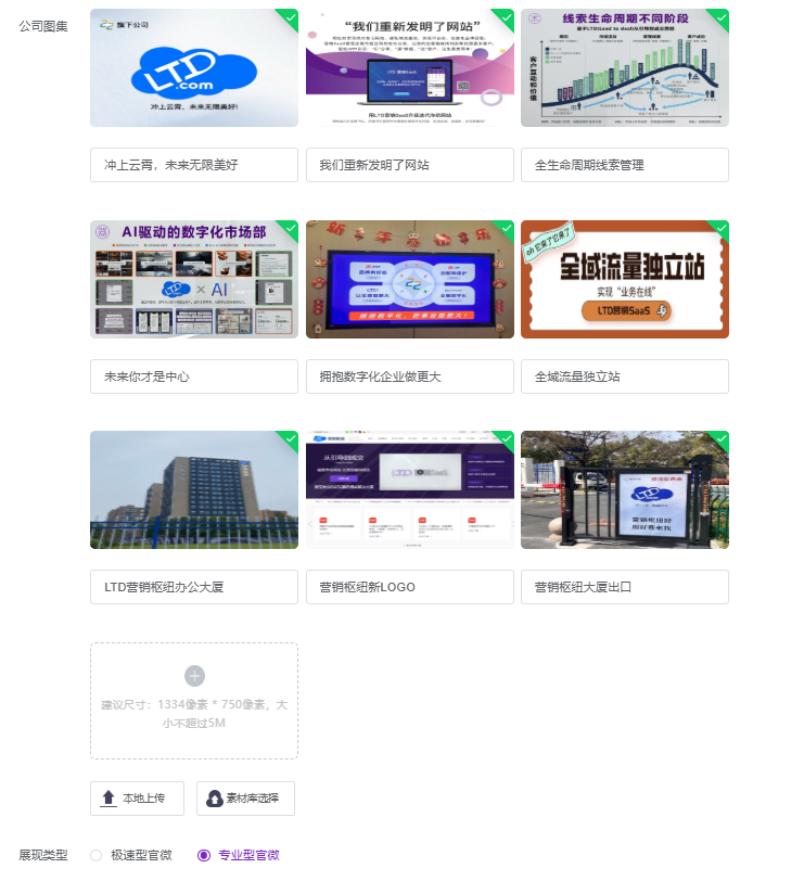 进入公司图集,按照建议尺寸上传高质量的办公环境、团队、荣誉等图片,充实品牌视觉资产库,增强小程序的信任感。