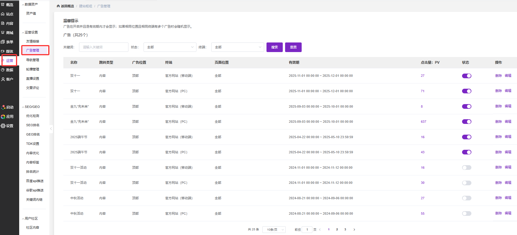 图示:广告资产运营总控台,展示所有广告(如25个),提供高级筛选、数据监控(点击量PV)及便捷的操作入口。顶部的“温馨提示”明确了“状态+有效期+随机轮播”的核心智能投放规则。