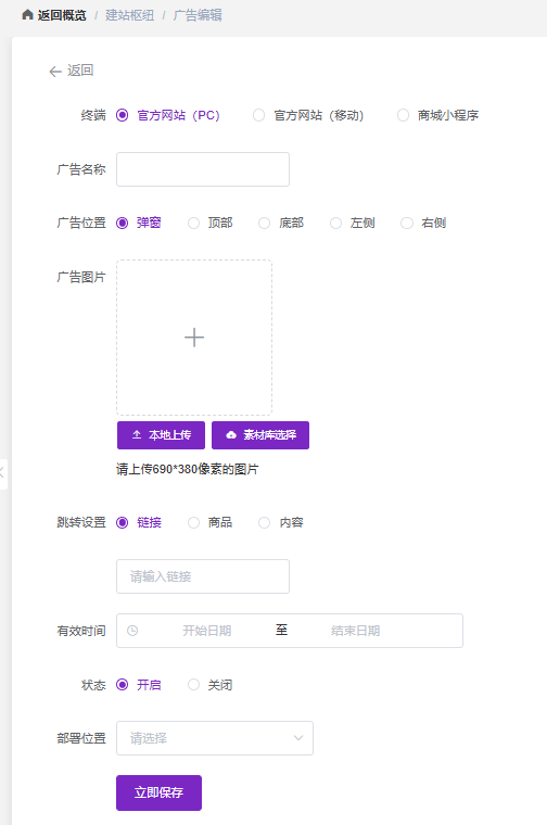 在创建广告时,系统会根据选择的“广告位置”和“终端”自动提示所需图片的精确尺寸(如顶部PC: 320 * 35px),从源头确保视觉素材的专业性。支持“本地上传”与“素材库选择”双渠道,并可直接关联站内商品、内容或外部链接。