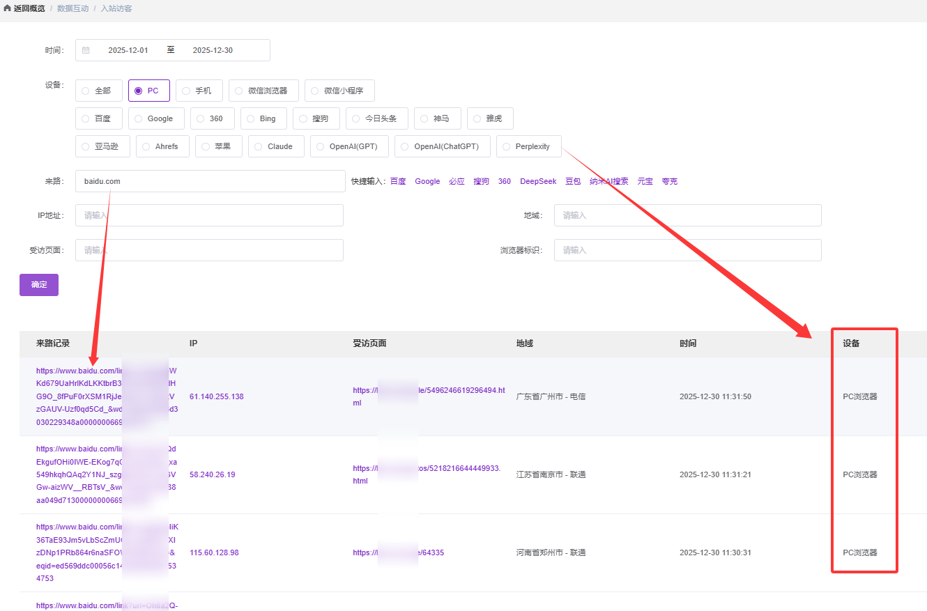 图示:精细化查询与结果展示页,展示了执行一次具体筛选(如设备=PC,来源=baidu.com)后的数据结果,体现了系统从海量访问中精准定位特定用户群体的能力。
