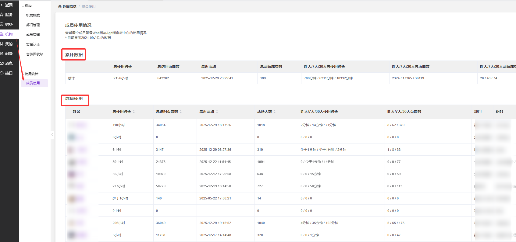 管理者进入数据互动 -> 使用统计 -> 成员使用。查看“累计数据”看板,关注“总活跃成员数”、“总使用时长”等核心指标及周期对比,掌握整体趋势。