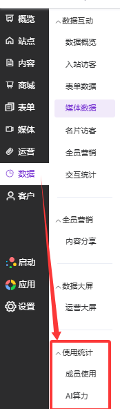 图示:系统功能总览,展示了“数据互动”模块下包含“入站访客”、“成员使用”、“全员营销”、“数据大屏”等完整的数据洞察体系,明确了“成员使用”数据的战略定位。