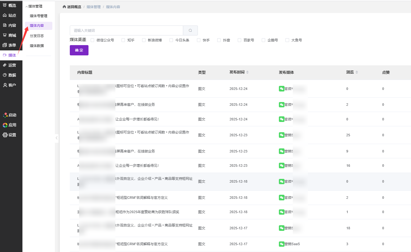图示:内容资产集中档案馆,将各平台已发布内容统一归档,支持按“媒体渠道”筛选,实现跨平台内容的统一检索、查看与数据对比。