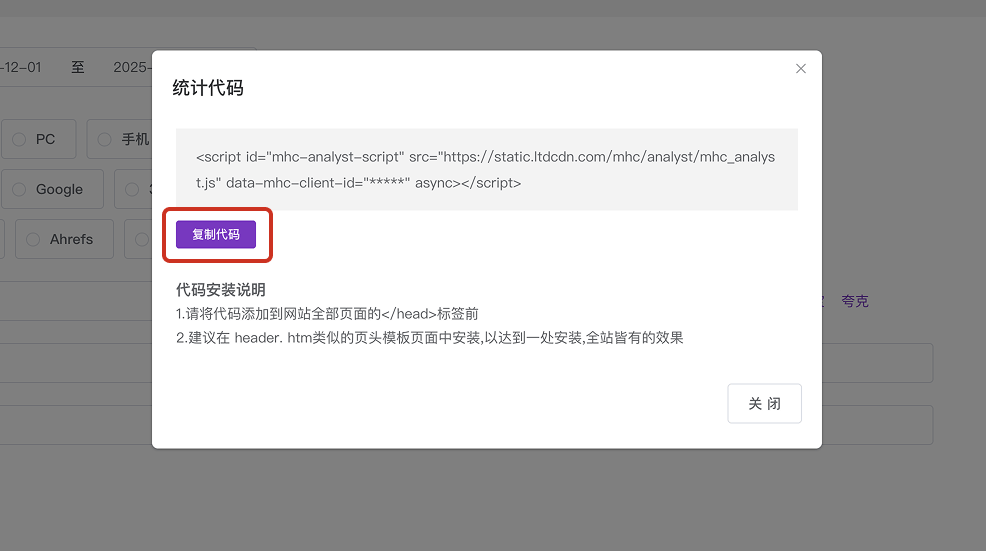 图示:统计代码弹窗,提供完整的JavaScript代码和"复制代码"按钮,支持一键复制。
