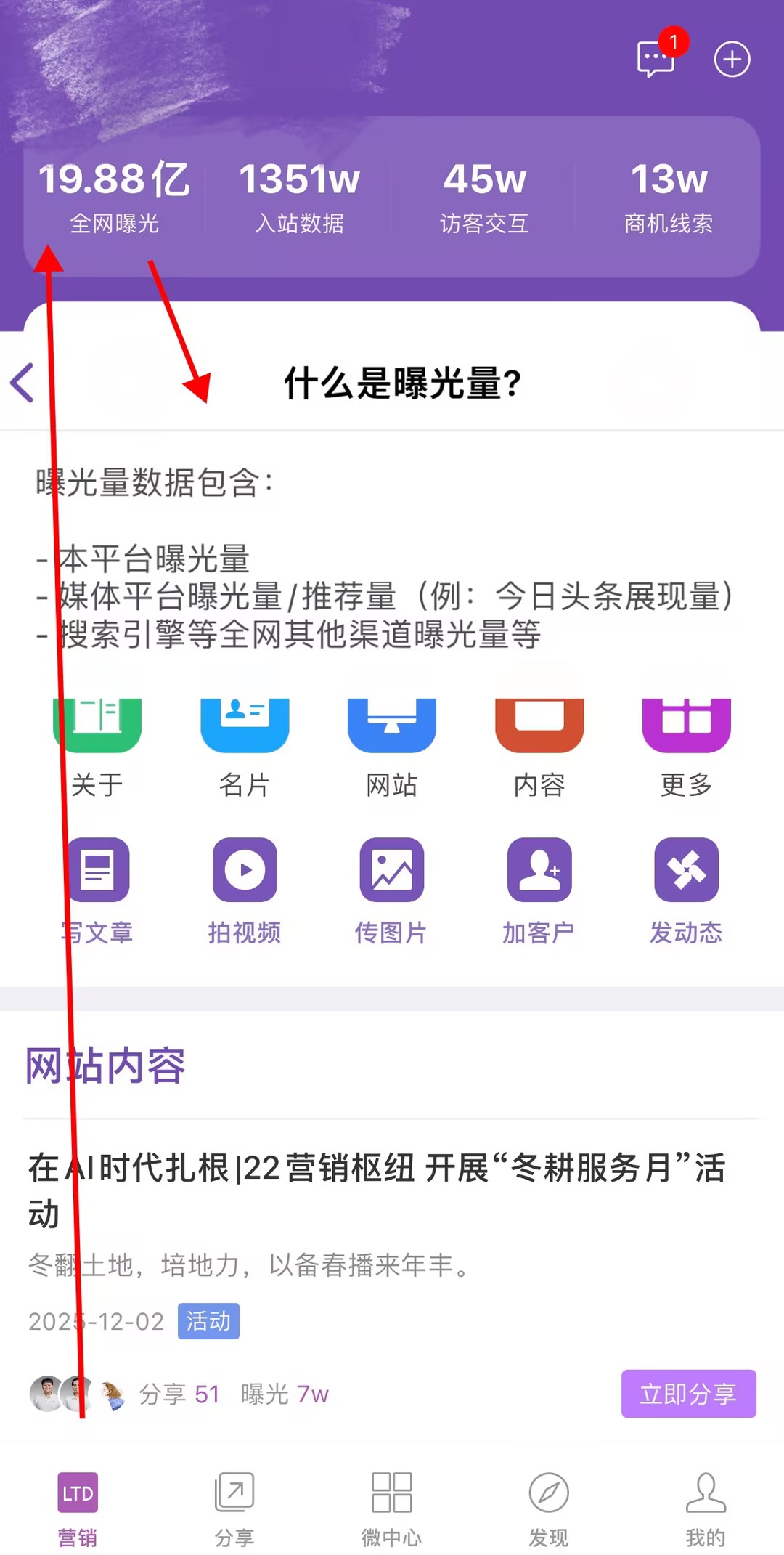 4. 底部导航栏:营销、分享、微中心、发现、我的,覆盖全场景工作流