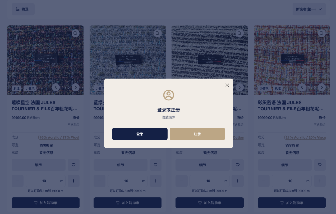 (图示说明:页面展示多款面料商品,每款包含图片、名称、原价、成分、可定米数等信息。中央弹窗提示“登录或注册”,用于未登录用户尝试收藏时的引导。页面顶部有筛选和“新来者(第一)”标签。清晰展示了商品列表、收藏登录态判断及加入购物车功能。)