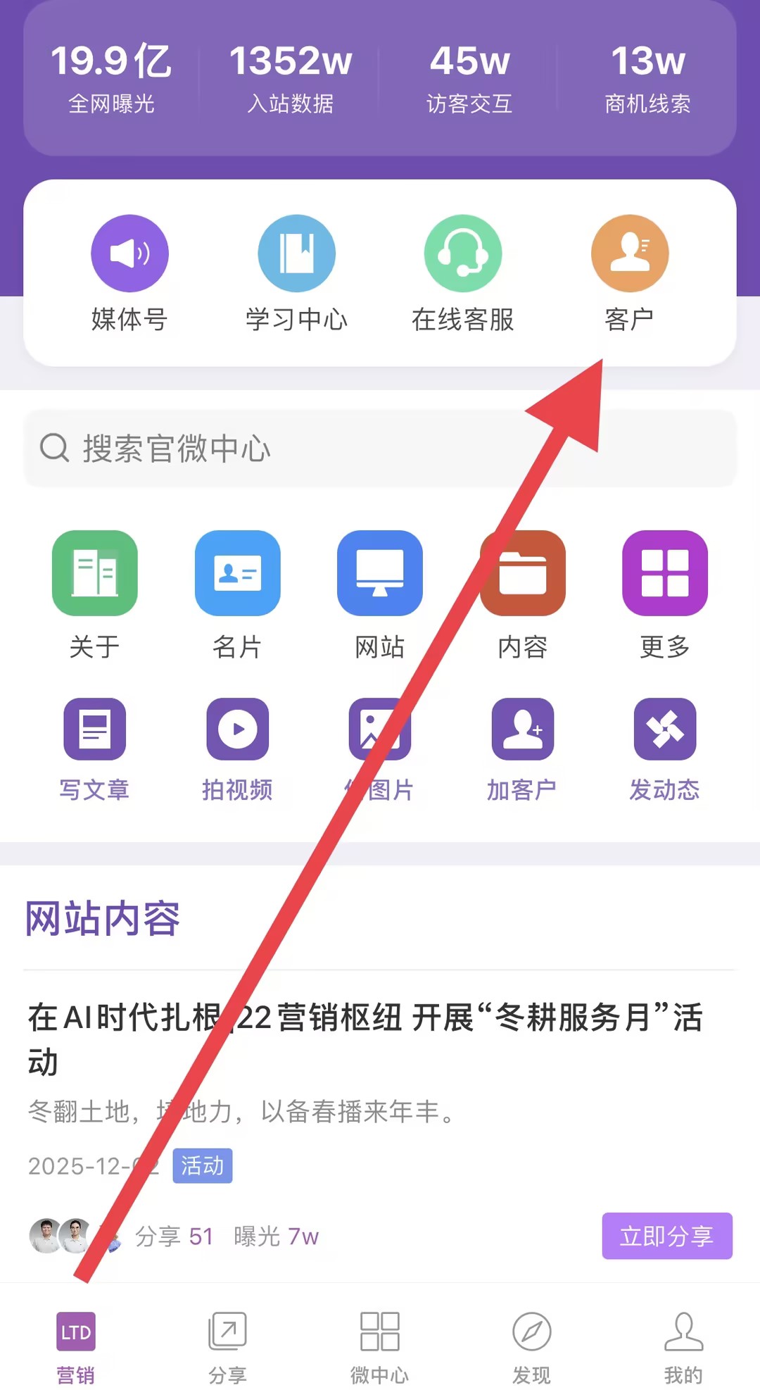 图示:营销与客户管理总入口,通过红色箭头突出"客户"核心工作场景,展示四大核心营销指标,集成高频功能入口,是启动所有工作的起点。