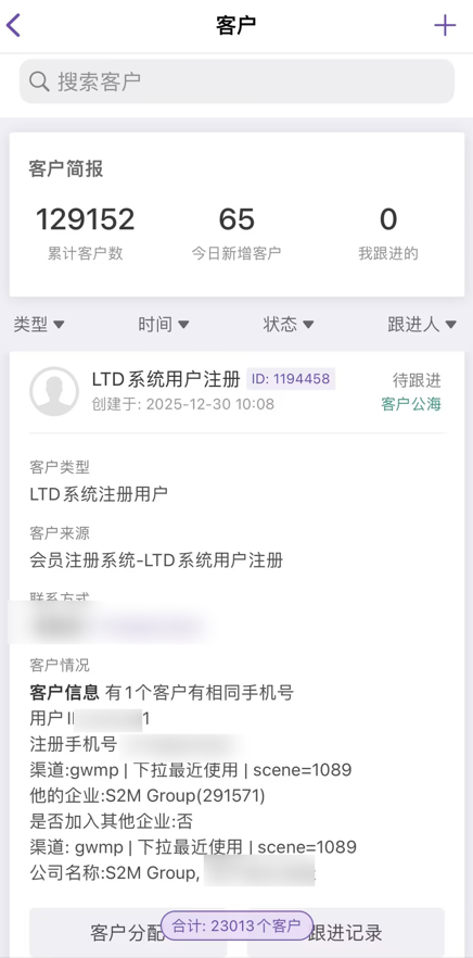 打开APP从首页点击"客户"入口进入客户列表页,查看简报看板中"我跟进"数量变化,通过筛选器设置"状态"为"待跟进"找到新分配线索。