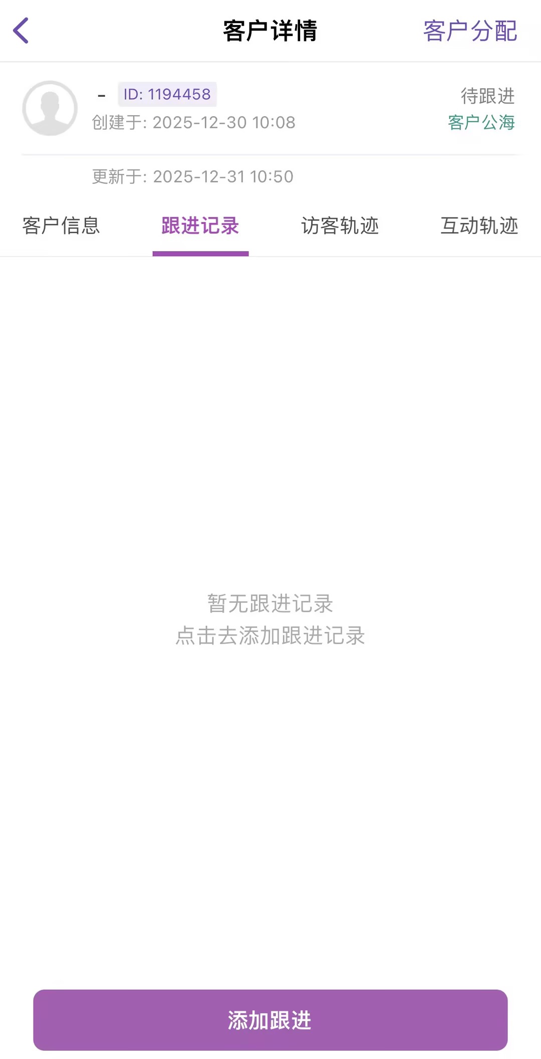 在"跟进记录"Tab中点击"添加跟进"按钮,记录本次沟通要点、客户意向、下一步计划,形成标准销售过程记录。