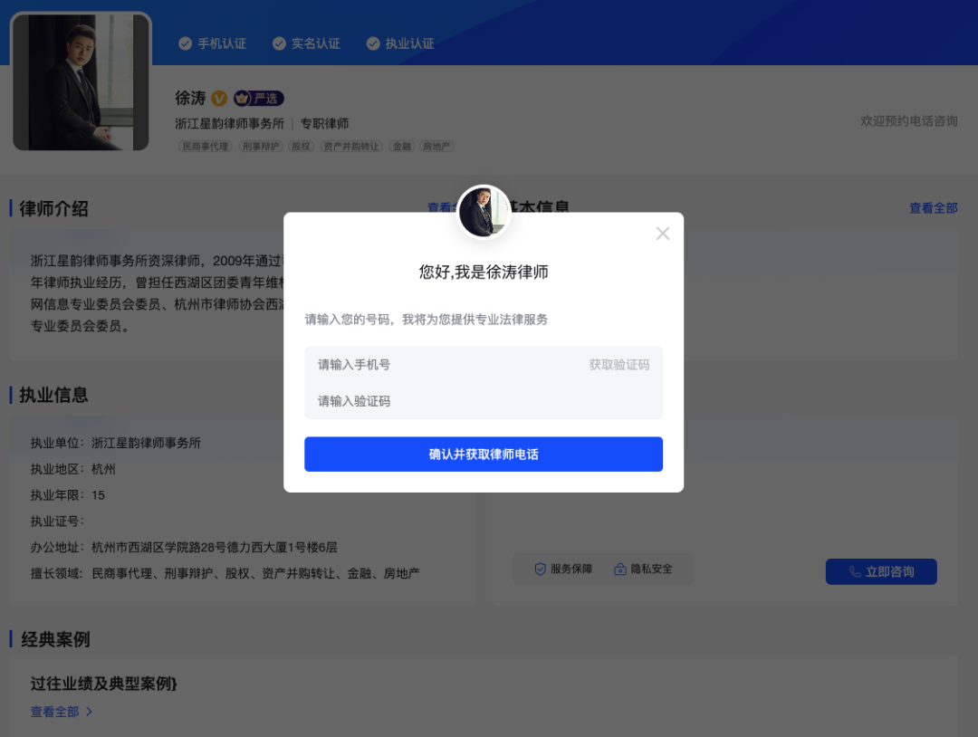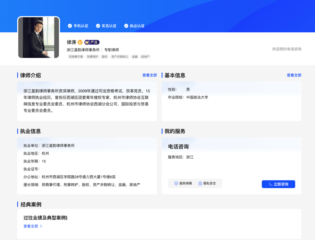 (图示说明:页面顶部蓝白渐变背景处清晰展示“手机认证”、“实名认证”、“执业认证”标识。页面主体分为左右两栏:左侧展示律师个人照片及基本信息(姓名:徐涛,律所:浙江星韵律师事务所);右侧详细展示“律师介绍”、“执业信息”、“经典案例”、“我的服务”等内容,右下角有醒目的“立即咨询”蓝色按钮。)