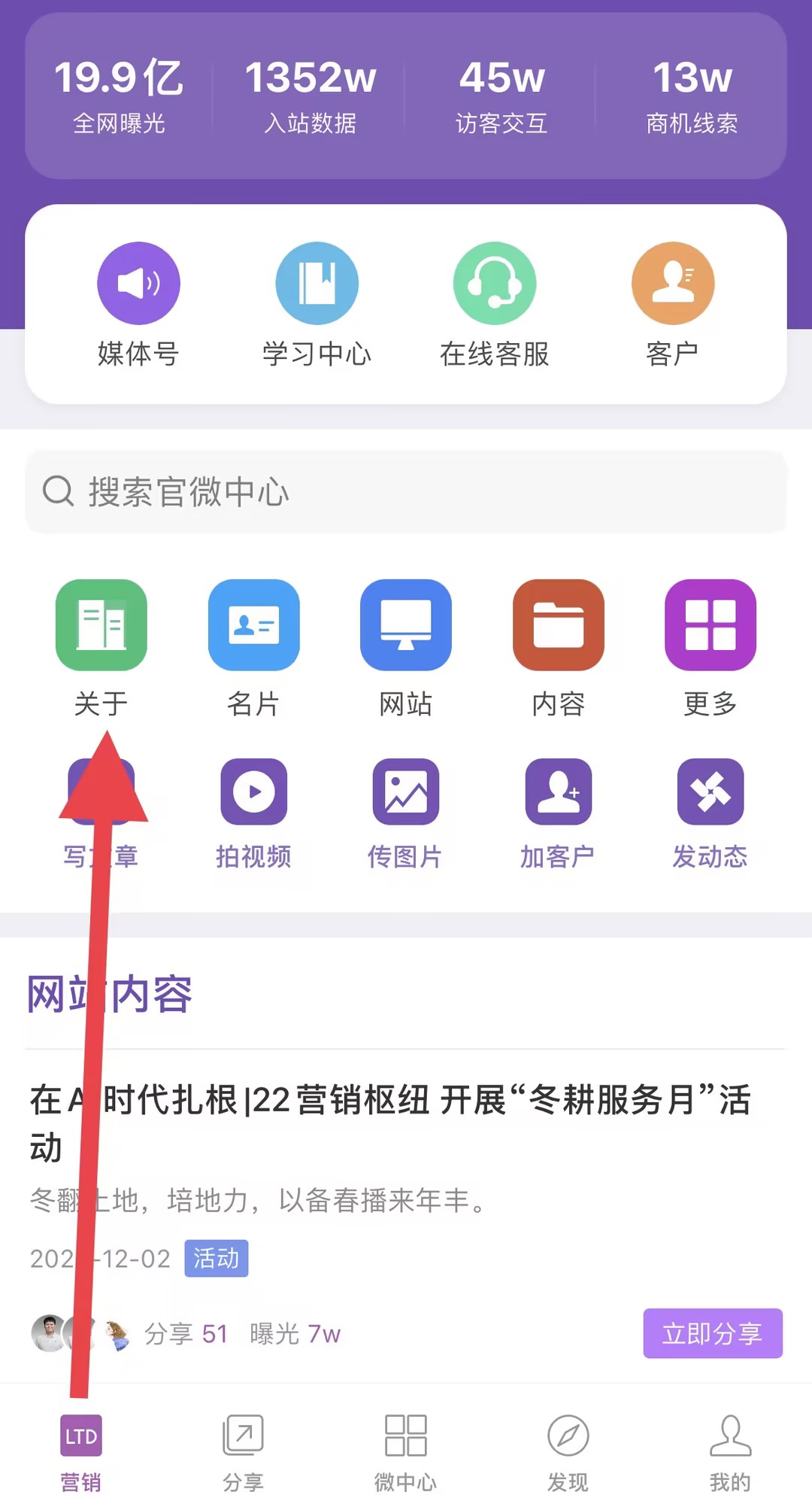 在首页看到营销数据后,可立即点击"写文章"创作相关复盘或跟进内容,实现"看数据->产生灵感->立即创作"的极短工作流,激发创作灵感提升产出效率。