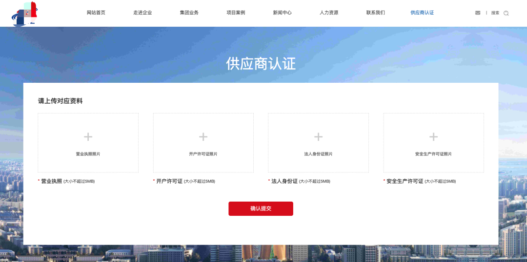 (图示说明:页面顶部为网站导航栏,主体部分以蓝天白云与城市建筑为背景。中央白色区域有醒目的“供应商认证”标题,下方依次排列四个文件上传区域,分别用于上传“营业执照照片”、“开户许可证照片”、“法人身份证照片”、“安全生产许可证照片”,并标注文件大小限制。底部为红色“确认提交”按钮,页面设计专业、流程清晰。)