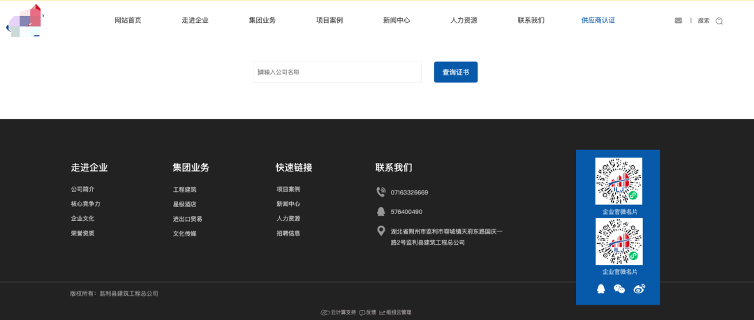 (图示说明:页面顶部导航栏中包含“供应商认证”入口。页面主体提供了查询功能,包含“请输入公司名称”的搜索输入框和“查询证书”按钮。下方为网站页脚,展示了企业联系方式与官微二维码。此页面用于外部伙伴验证供应商的认证资质。)