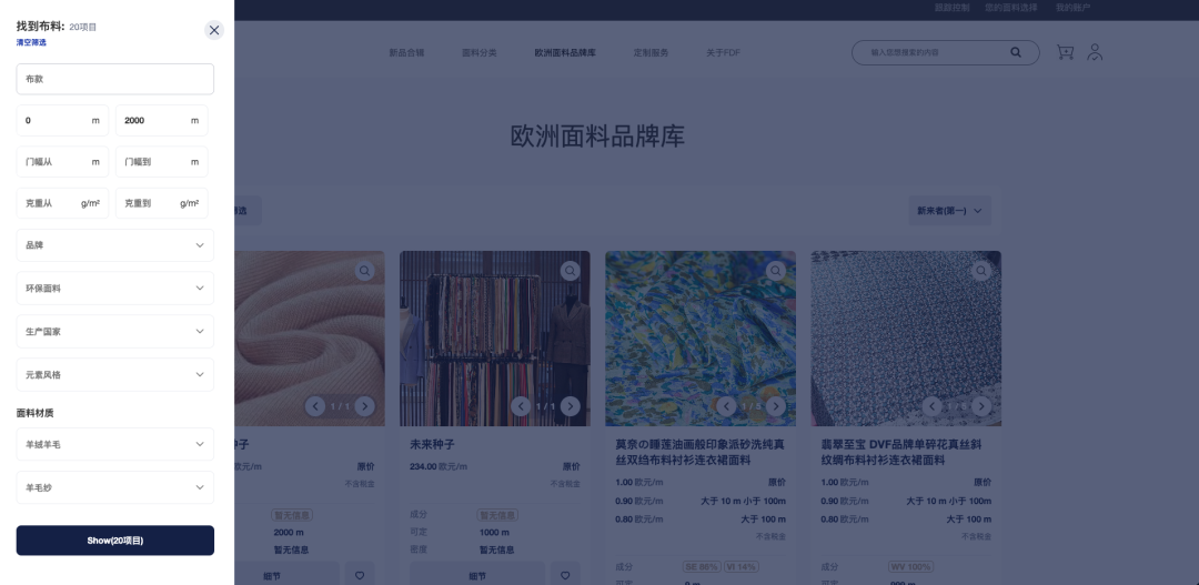 (图示说明:左侧为深色背景的筛选面板,提供“布款”、“门板从__ m 门板到__ m”、“克重从__ g/m² 克重到__ g/m²”等范围查询输入框,以及品牌、生产国家等多选筛选。右侧“欧洲面料品牌库”标题下,以网格形式展示多款面料商品的图片、名称、价格及可定米数。直观展示了针对专业采购的精确筛选能力。)