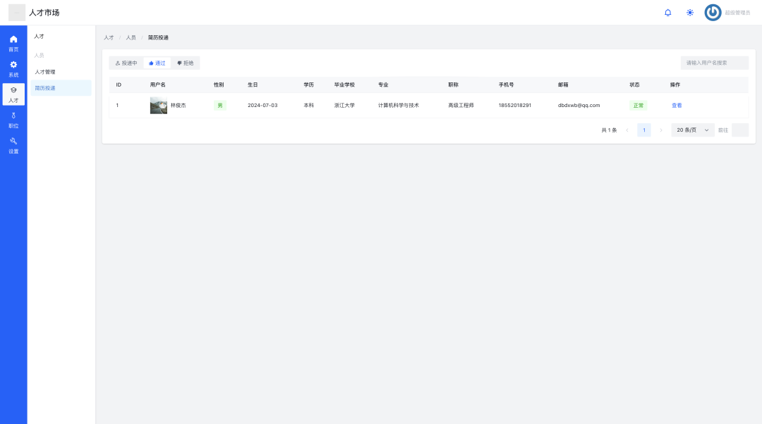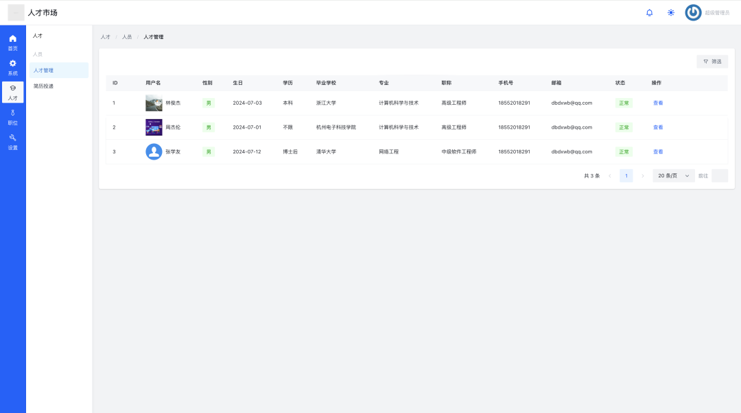在左侧导航栏点击「人才」->「人才管理」,进入人才列表页。使用顶部搜索框或筛选条件,查找符合要求的平台人才。点击“查看”按钮,可打开详情页深入了解候选人信息。