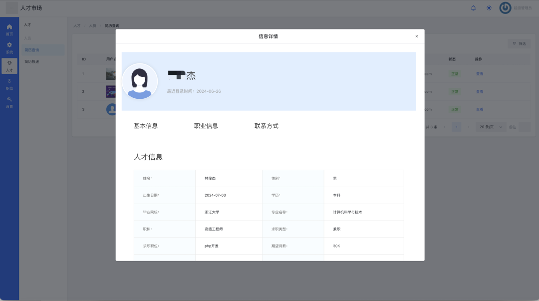 (图示说明:点击人才列表中的“查看”后弹出的详情弹窗。弹窗顶部为“信息详情”标题,下方分“基本信息”、“职业信息”、“联系方式”标签页,以表格形式详细展示了人才林俊杰的个人信息、求职意向、期望薪资等,供企业深度评估。)