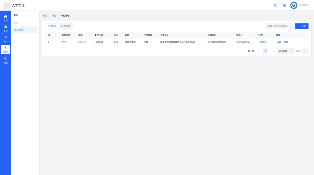 点击导航栏「职位」->「职位管理」,查看所有已发布的职位。可在此编辑职位信息,或对已招满或暂停的职位点击“关闭”操作,使其移入“已关闭”列表。