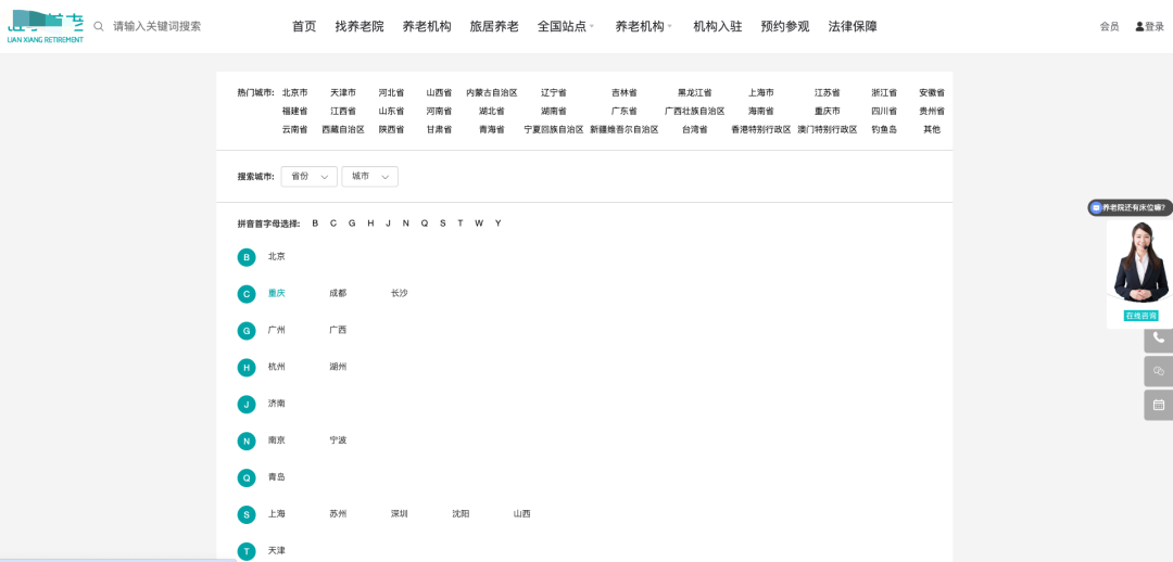 (图示说明:页面顶部为网站导航栏,包含“首页”、“找养老院”、“养老机构”、“旅居养老”等核心业务入口以及用户登录入口。主体部分以清晰的列表形式,提供了“热门城市”直接选择(如北京、上海、广州)、精确的“省份-城市”二级下拉菜单以及便捷的“拼音首字母选择”区(B, C, G等),三种方式协同,共同构成一个高效、直观的地区搜索门户。)