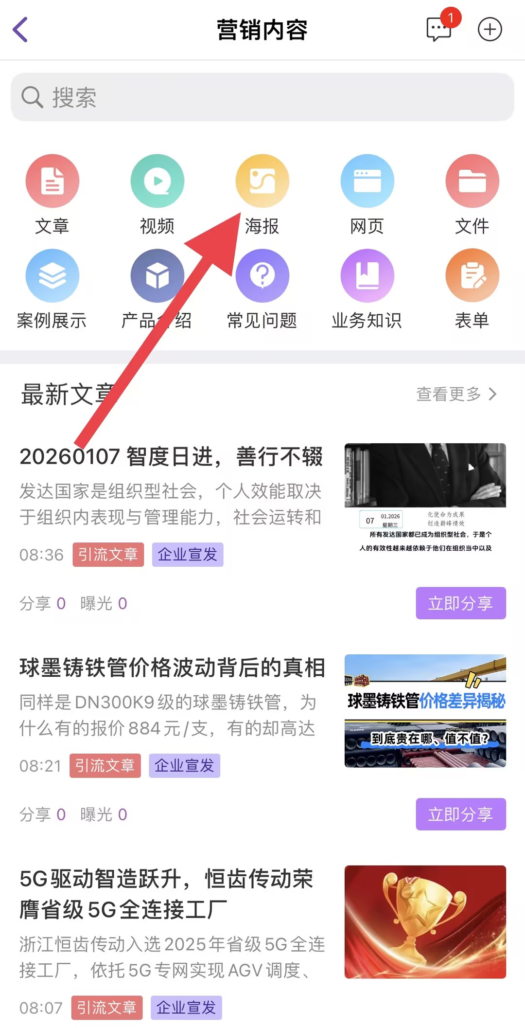在"营销内容"首页点击"海报"图标进入海报库,浏览历史海报或搜索相关主题寻找创作灵感。