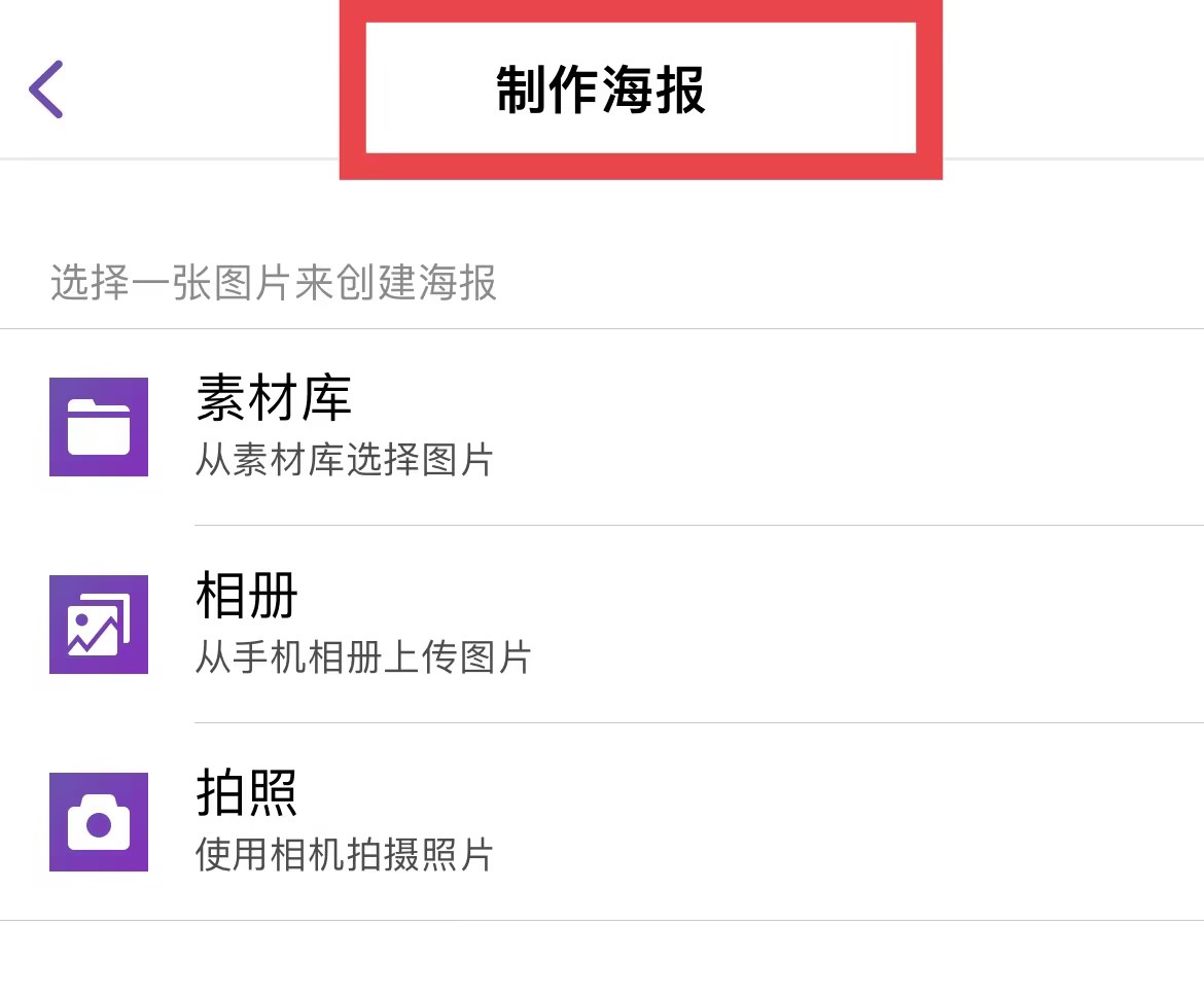 图示:海报创作启动器与素材选择器,提供素材库、相册、拍照三种图片来源,清晰的流程引导解决创作第一步的素材获取问题。